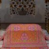 The hand-painted Rumala, inspired by the enchanting Gulbaksh flower, emerge as a testament to artistry and spirituality. Against an ivory canvas, vibrant orange and purple hues breathe life into intricate floral and geometric patterns.